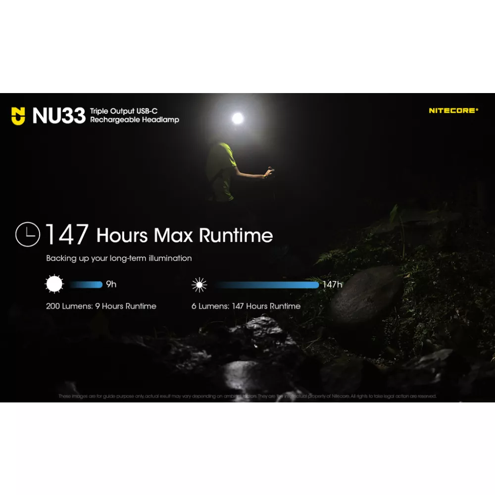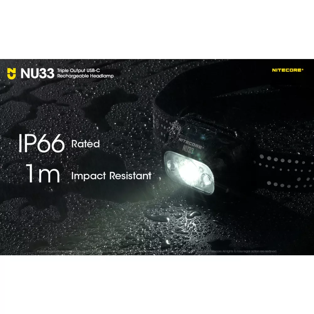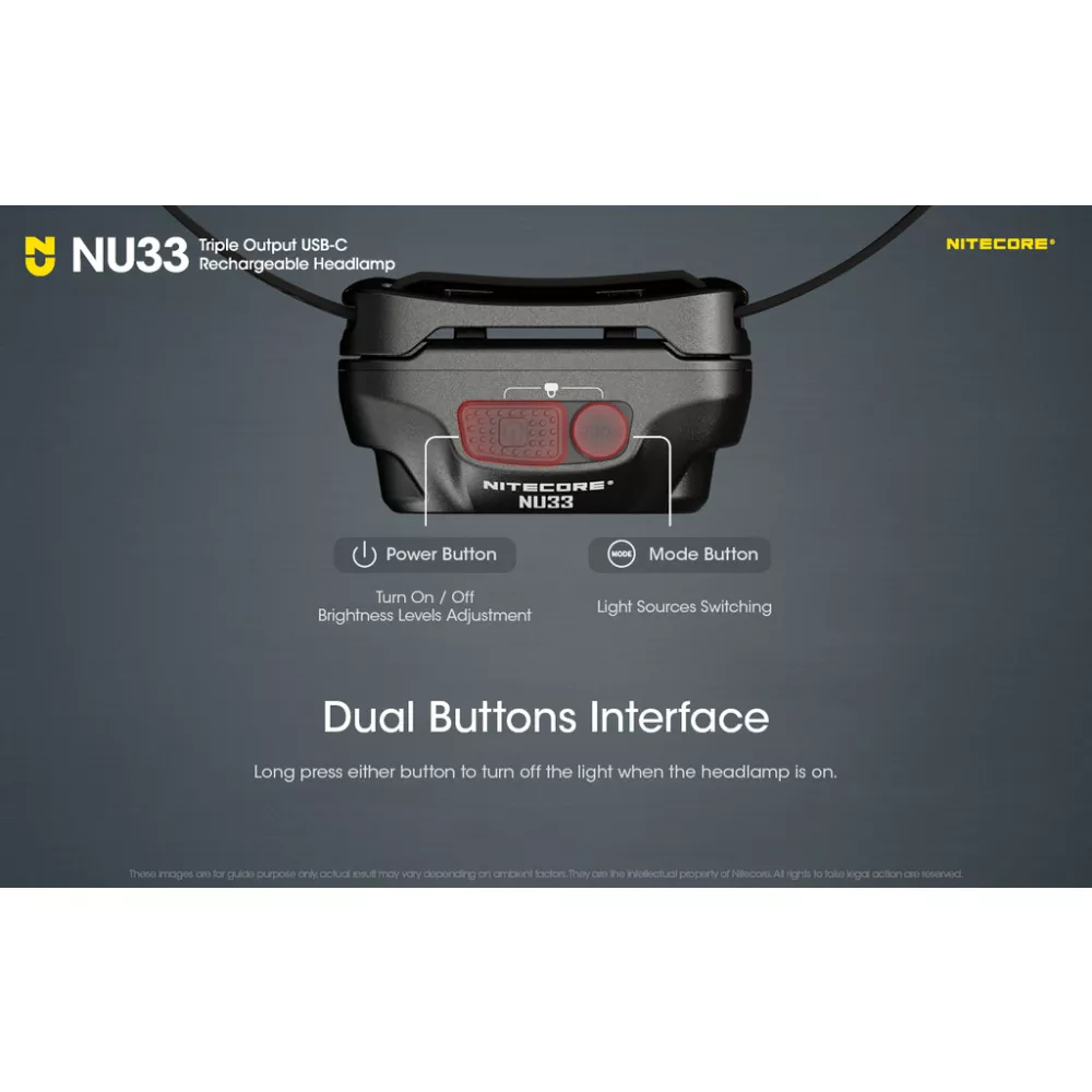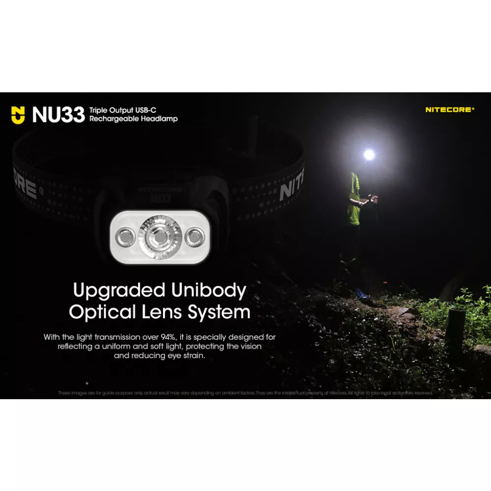 Nitecore NU33 je nová malá kompaktní a vysoce výkonná čelovka se světelným tokem 700 lumenů, intenzitou světelného kuželu 4 578 candela a dosvitem 135 metrů. Její hlavní předností je vysoká kapacita akumulátoru, 3 druhy svícení (bílá LED, červená LED a CRI teplá bílá LED) při zachování nízké hmotnosti 95,5 g a možnost uzamčení ovládacích tlačítek svítilny. Čelová svítilna se napájí integrovaným Li-ion akumulátorem o kapacitě 2000 mAh za pomoci USB-C nabíjecího portu.