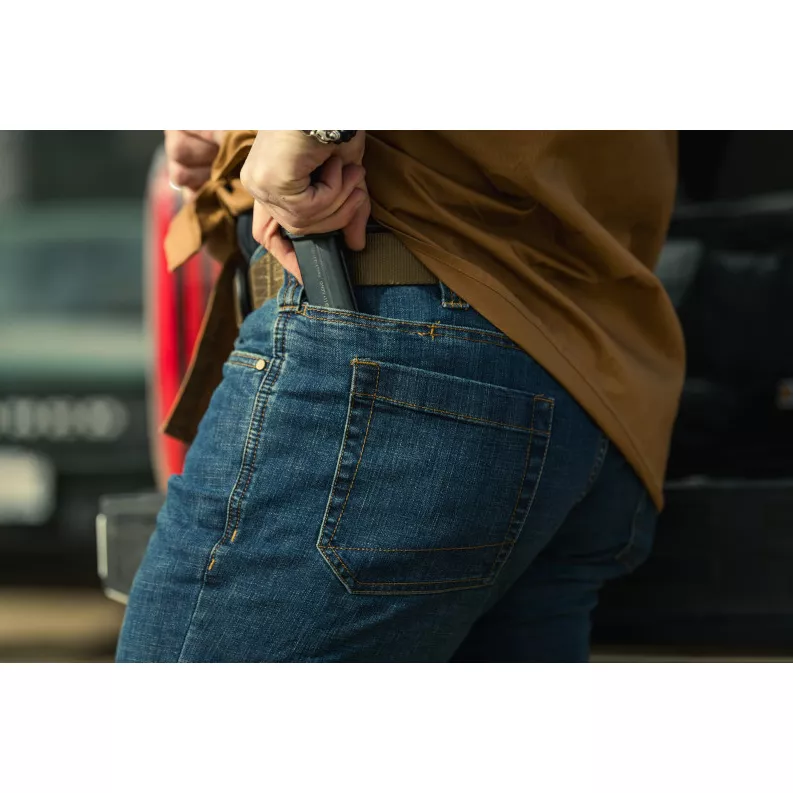 After searching for years for a denim fabric that meets our mission criteria we bring you the Defender-Flex Jean by 5.11 Tactical®. We can’t tell you the number of times our end users have asked us to do a jean and we know it's a favorite on the range as well as just about everywhere else. The Defender-Flex Jean is offered in performance stretch denim fabric in two washed colors. We know it’ll be at home out on the firing line, at your weekend bbq or out for a casual dinner. An innovative cotton/polyester mechanical stretch denim means better flexibility and easier mobility, plus five pockets for a normal everyday appearance, and two hidden AR mag pockets.