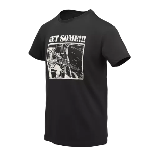 Klasické bavlněné tričko s odkazem na ikonickou scénu ve stejně ikonickém filmu Stanleyho Kubricka Olověná vesta (Full Metal Jacket) z roku 1987, kde seržant Hartman střílí z vrtulníku a křičí: „Get some!“. Charakteristický tvar triček se vyvinul na počátku 20. století z předchozího spodního prádla (známého jako odborový oblek). Po druhé světové válce se bavlněná trička ve tvaru písmene T stala velmi populárními, částečně díky Marlonu Brandovi a Jamesi Deanovi, kteří je nosili na plátně.