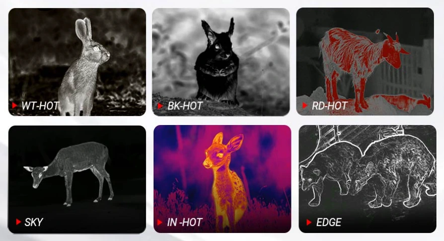 Pozorování Vám zpříjemní i 6 zobrazovacích módů (White Hot, Black Hot, Red Hot, EDGE, IN HOT, SKY) a máte také na výběr ze tří pozorovacích scén (City, Rain, Forest).