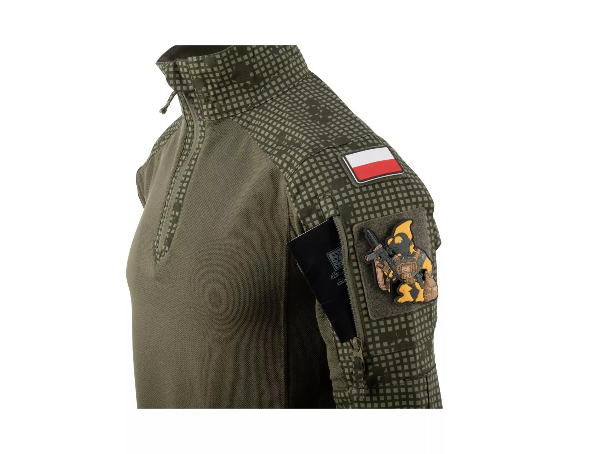 Dva panely na suchý zip na ramenou umožňují rychlou a efektivní personalizaci pomocí různých nášivek, včetně vlajek zemí. Tato lehká košile skvěle poslouží v horkých dnech, zejména v kombinaci s nosiči plátů, hrudními soupravami nebo jinými vestami.