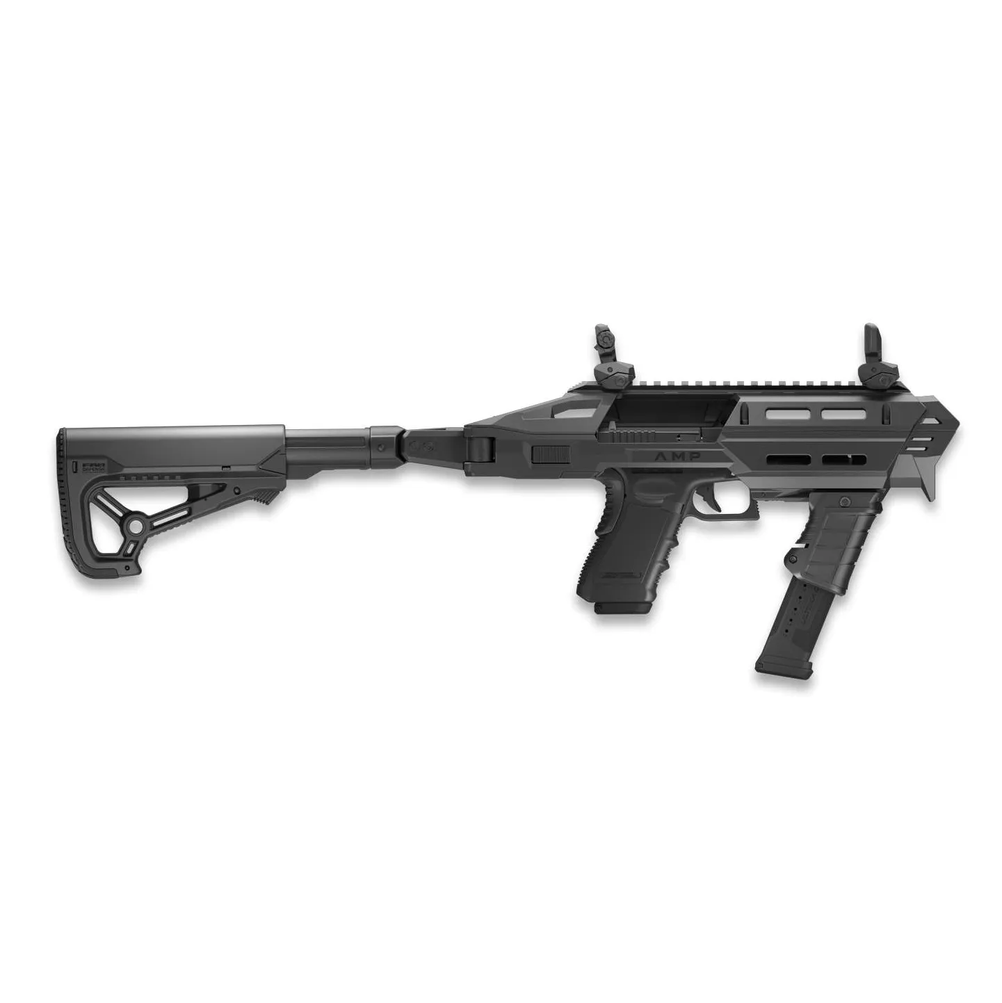 Karabinová konverze FAB Defense AMP PRO pro různé typy pistolí. Tento model Vaší pistoli přetvoří na kompaktní karabinovou platformu se sklopnou pažbou a přední rukojetí MG-9, která funguje jako držák zásobníku.