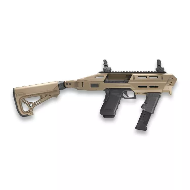 Karabinová konverze FAB Defense AMP PRO pro různé typy pistolí. Tento model Vaší pistoli přetvoří na kompaktní karabinovou platformu se sklopnou pažbou a přední rukojetí MG-9, která funguje jako držák zásobníku.
