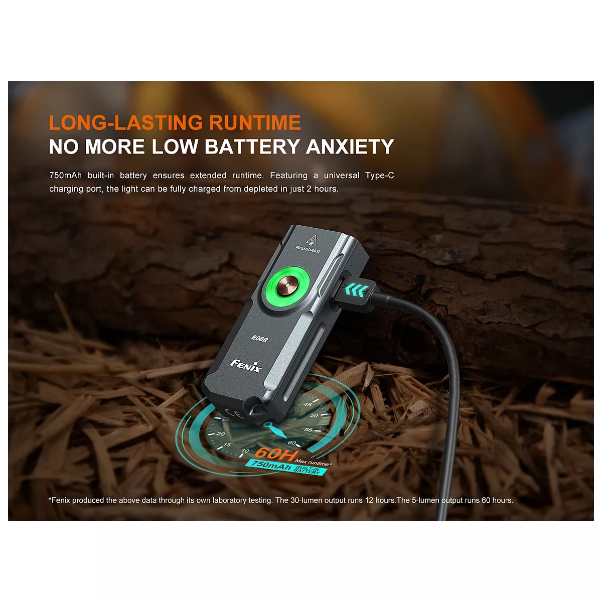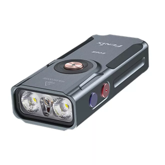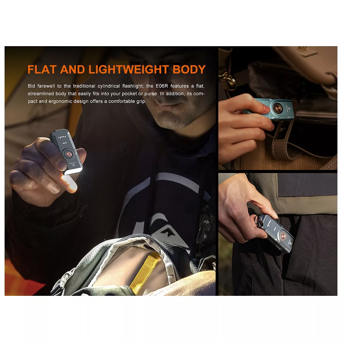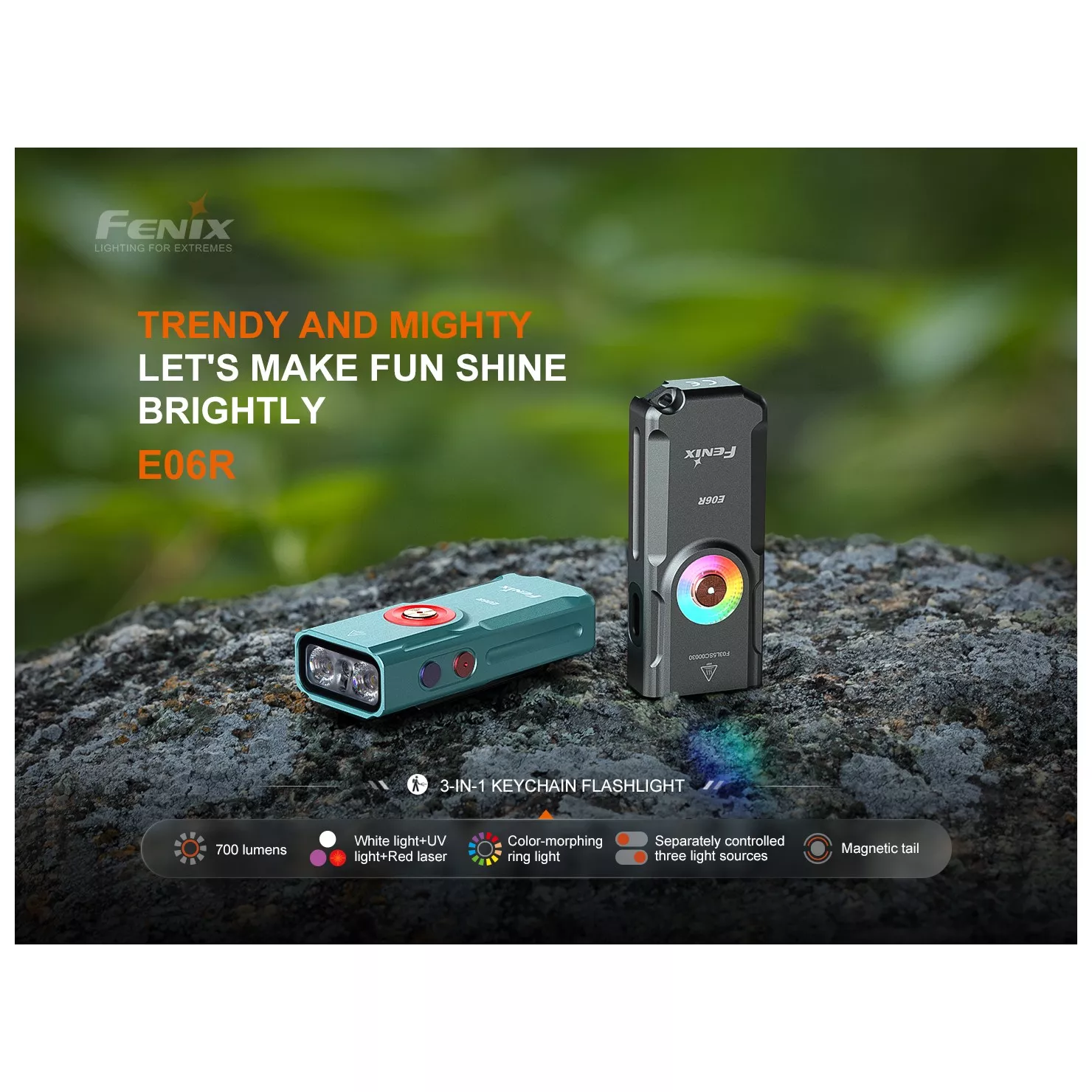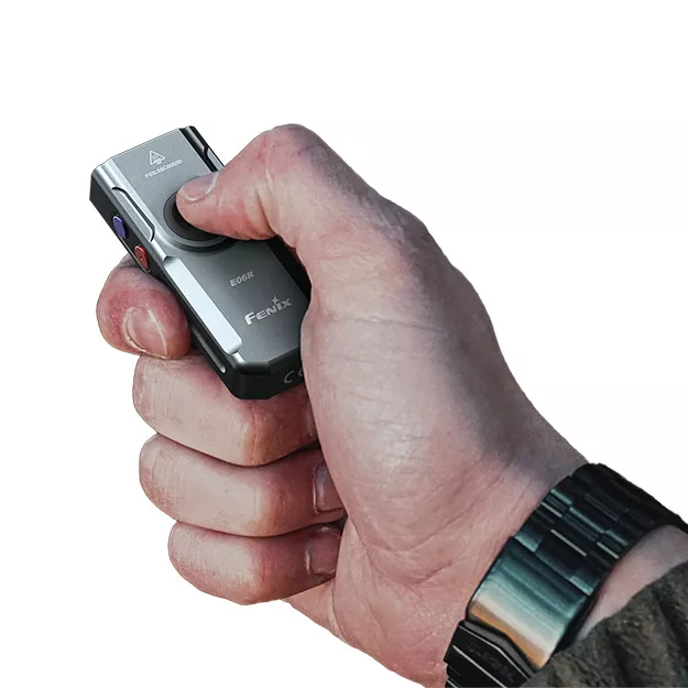 Fenix E06R je větší variantou úspěšné miniaturní nabíjecí svítilny Fenix E03R V2.0. Proti ní má nejen vyšší výkon, ale i ultrafialové světlo a laserové ukazovátko. I přes kompaktní rozměry a váhu pouhých 54 gramů nabízí vysoký světelný tok až 700 lumenů (ANSI). Světelný kužel rovnoměrně osvětluje široký prostor až do vzdálenosti 110 metrů. K napájení slouží integrovaný akumulátor s kapacitou 750 mAh, který se nabíjí přes moderní USB-C konektor na boku svítilny. K dispozici jsou celkem čtyři režimy bílého světla, UV světlo s vlnovou délkou 365 nm o síle 580 mW, červený laser (ukazovátko ≤0,39 mW) a několik režimů tzv. Breathing light - světla okolo spínacího tlačítka o síle 0,5 až 1 lumen, které využijete pro nenápadnou signalizaci, či identifikaci umístění svítilny. Svítilna je dodávána včetně pevného klipu, takže ji můžete uchytit na kapsu, popruh batohu či kšilt čepice a uvolnit si tak při svícení ruce. Díky magnetu v patce svítilny ji můžete přichytit k čemukoli železnému. Praktický je také indikátor stavu nabití baterie v tlačítku. Svítilna je skvělá pro EDC a díky malým rozměrům, plochému tvaru a váze ji můžete mít stále u sebe.