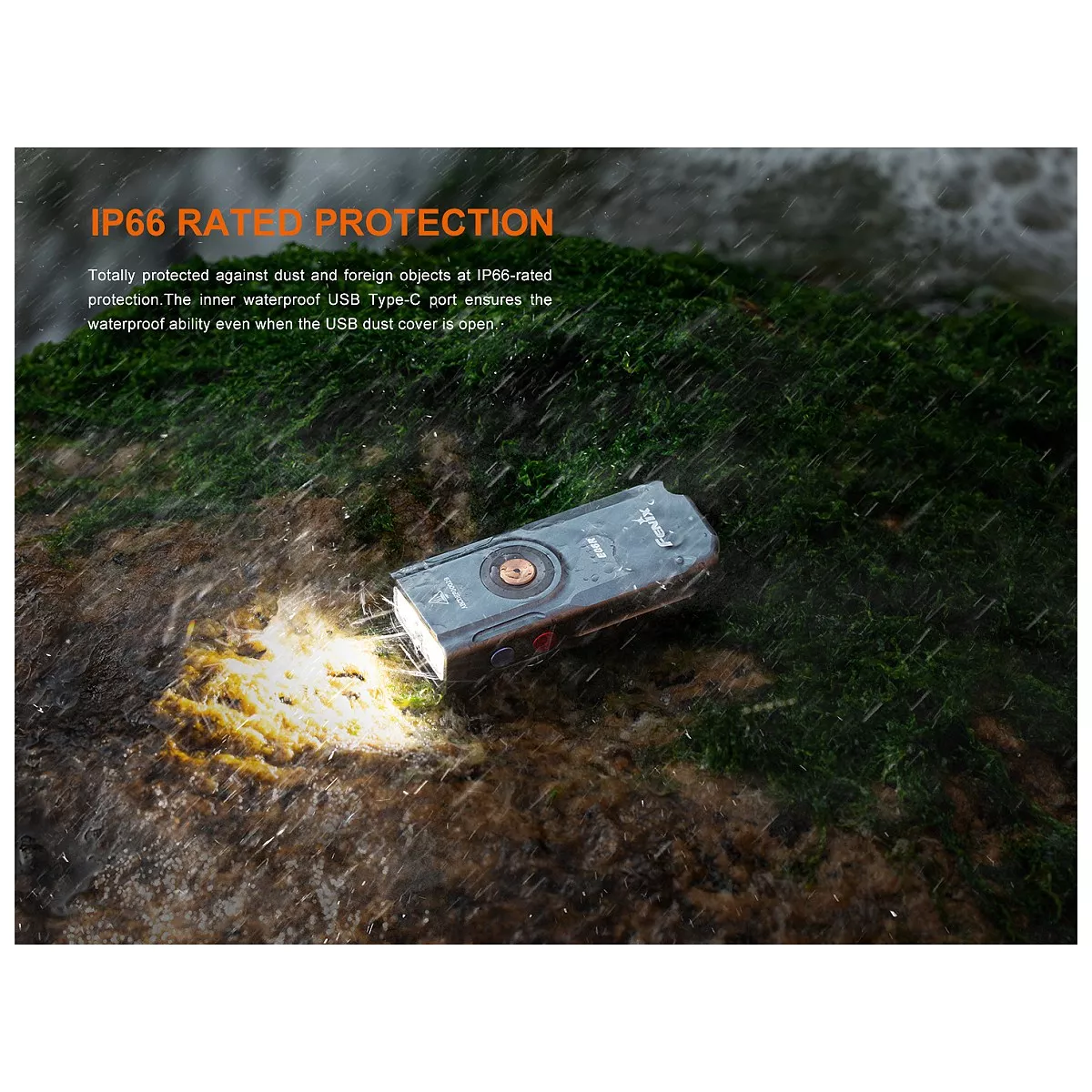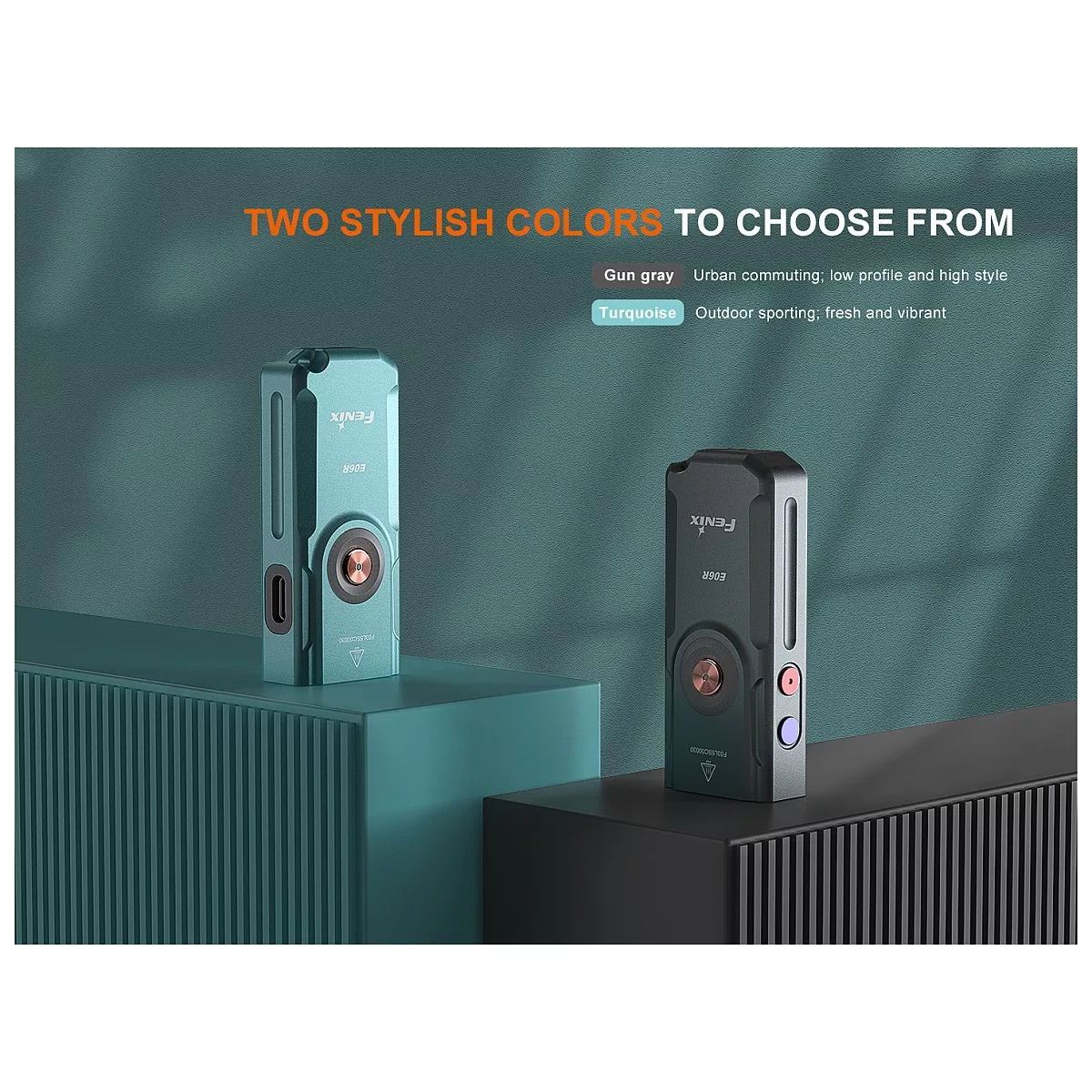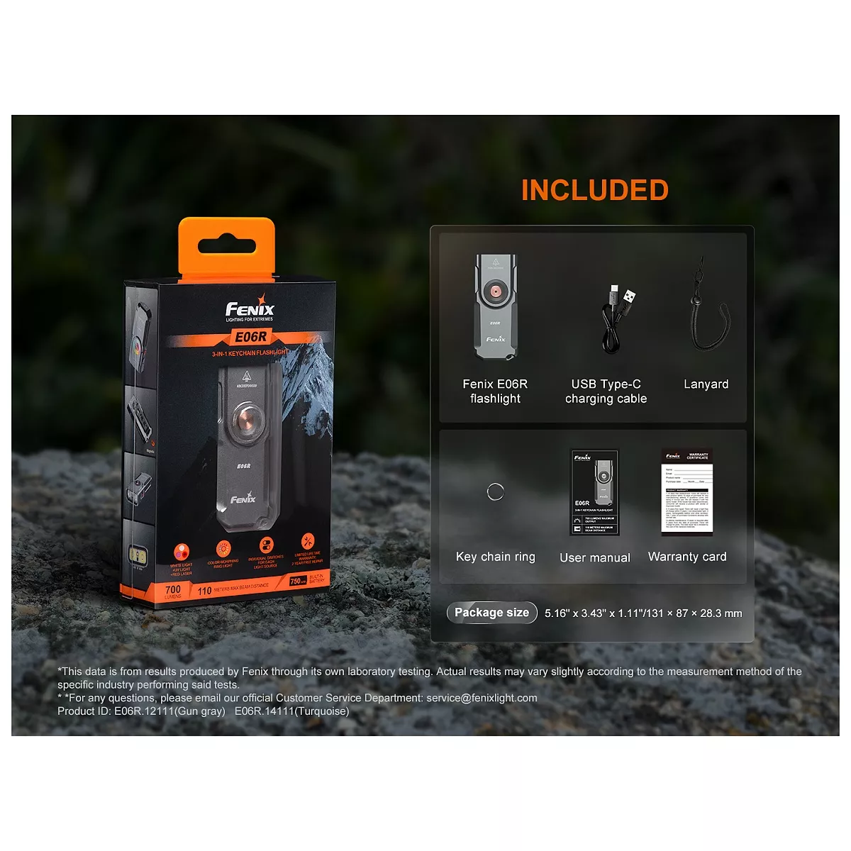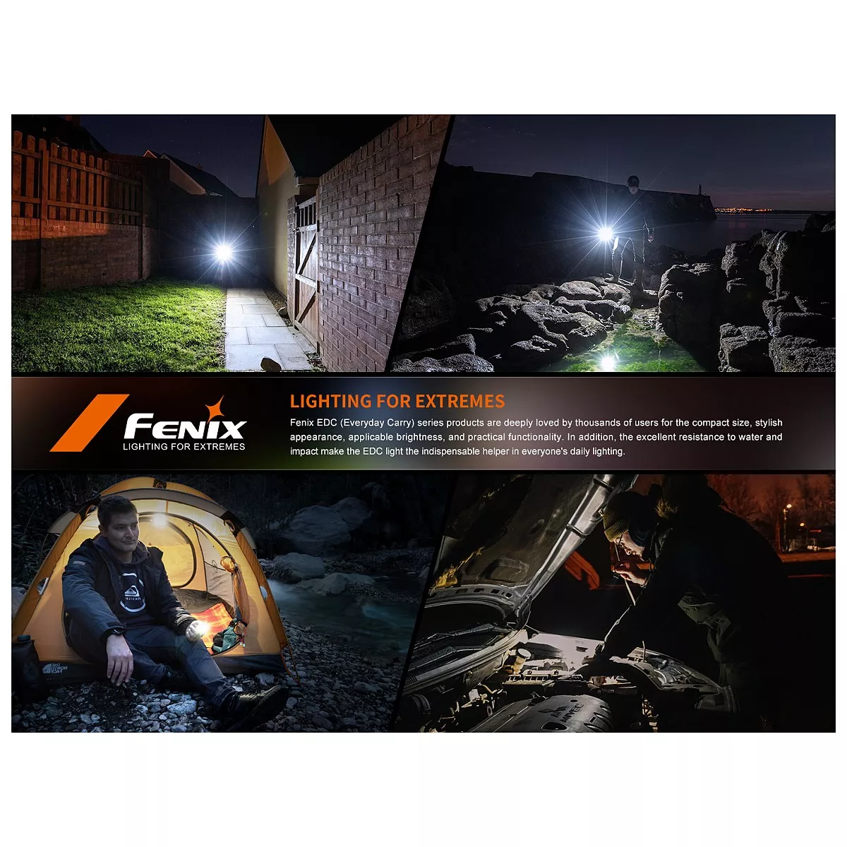 Fenix E06R je větší variantou úspěšné miniaturní nabíjecí svítilny Fenix E03R V2.0. Proti ní má nejen vyšší výkon, ale i ultrafialové světlo a laserové ukazovátko. I přes kompaktní rozměry a váhu pouhých 54 gramů nabízí vysoký světelný tok až 700 lumenů (ANSI). Světelný kužel rovnoměrně osvětluje široký prostor až do vzdálenosti 110 metrů. K napájení slouží integrovaný akumulátor s kapacitou 750 mAh, který se nabíjí přes moderní USB-C konektor na boku svítilny. K dispozici jsou celkem čtyři režimy bílého světla, UV světlo s vlnovou délkou 365 nm o síle 580 mW, červený laser (ukazovátko ≤0,39 mW) a několik režimů tzv. Breathing light - světla okolo spínacího tlačítka o síle 0,5 až 1 lumen, které využijete pro nenápadnou signalizaci, či identifikaci umístění svítilny. Svítilna je dodávána včetně pevného klipu, takže ji můžete uchytit na kapsu, popruh batohu či kšilt čepice a uvolnit si tak při svícení ruce. Díky magnetu v patce svítilny ji můžete přichytit k čemukoli železnému. Praktický je také indikátor stavu nabití baterie v tlačítku. Svítilna je skvělá pro EDC a díky malým rozměrům, plochému tvaru a váze ji můžete mít stále u sebe.