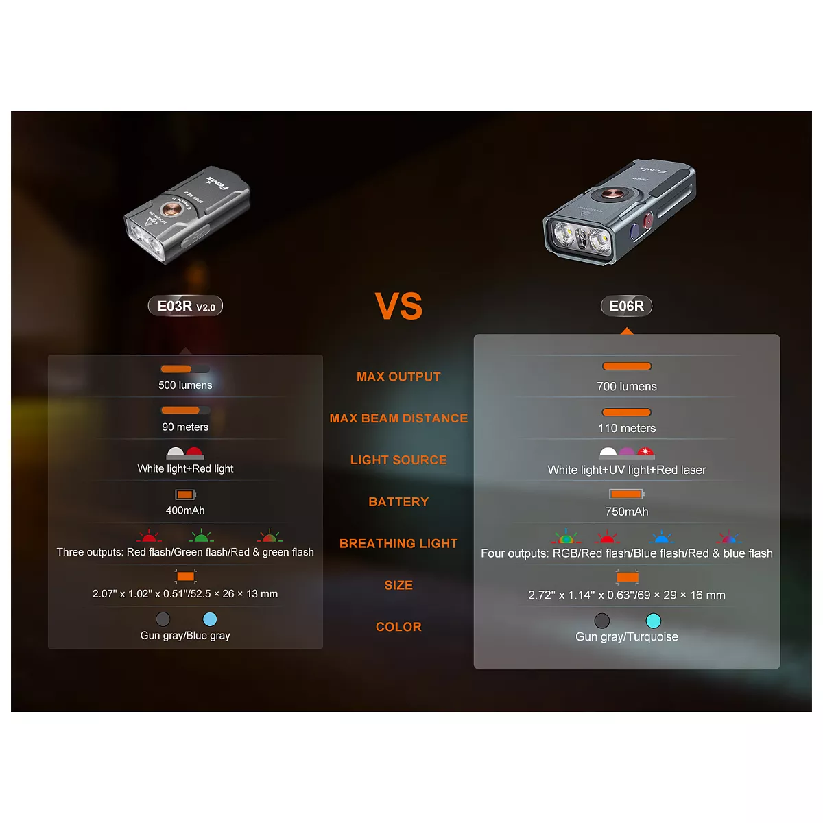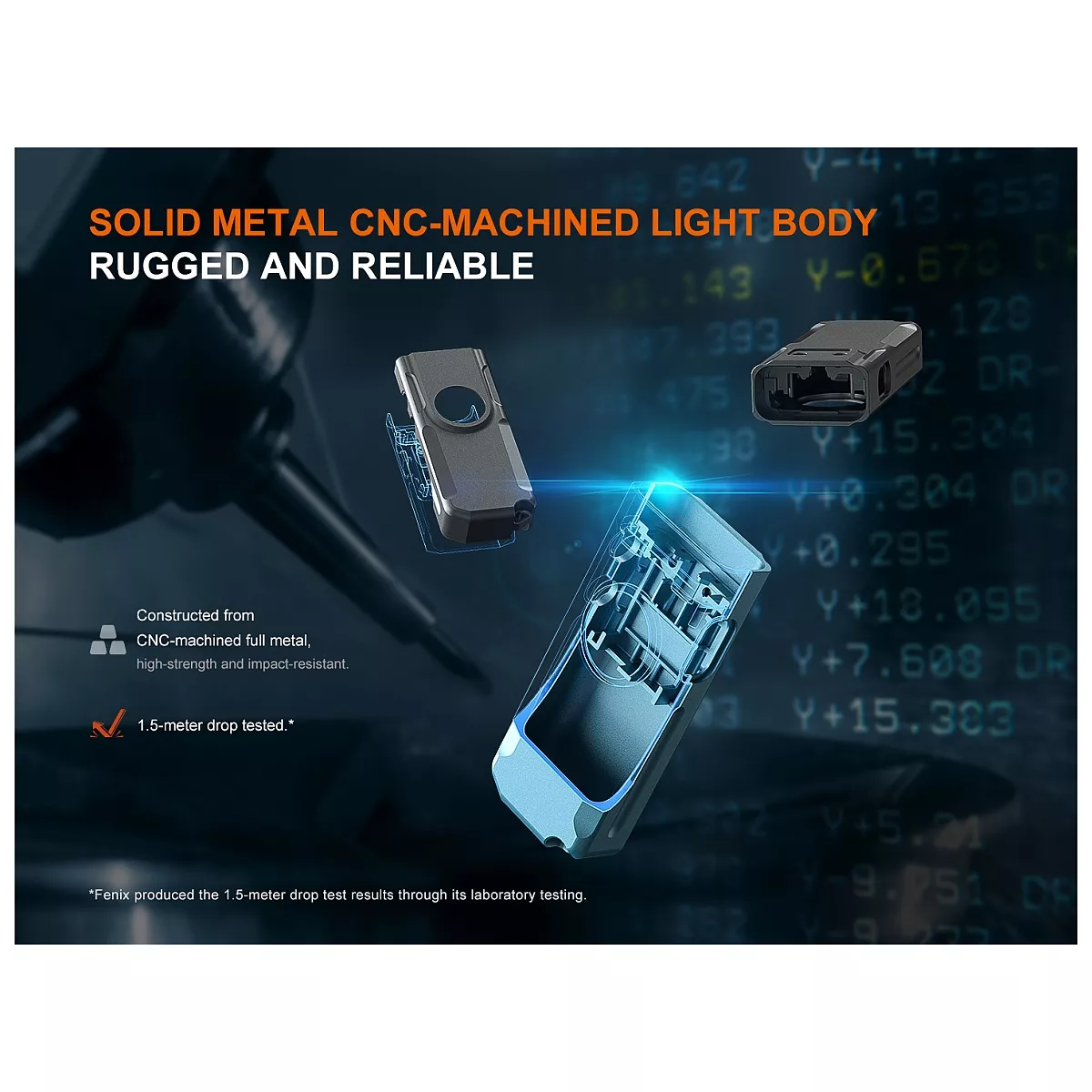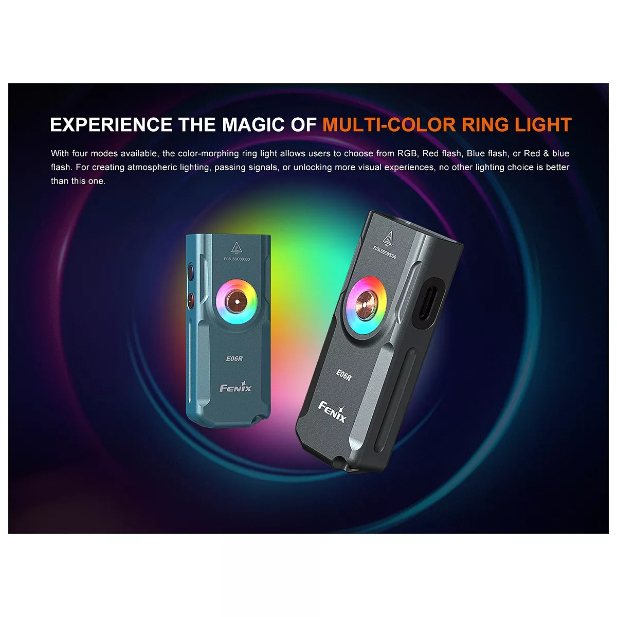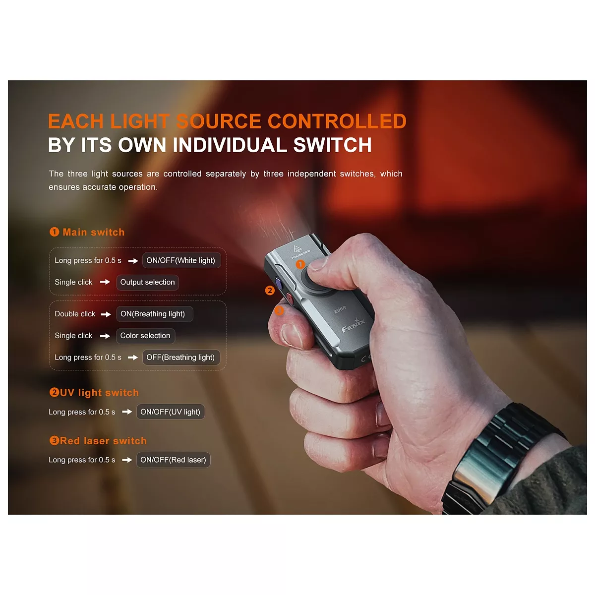 Fenix E06R je větší variantou úspěšné miniaturní nabíjecí svítilny Fenix E03R V2.0. Proti ní má nejen vyšší výkon, ale i ultrafialové světlo a laserové ukazovátko. I přes kompaktní rozměry a váhu pouhých 54 gramů nabízí vysoký světelný tok až 700 lumenů (ANSI). Světelný kužel rovnoměrně osvětluje široký prostor až do vzdálenosti 110 metrů. K napájení slouží integrovaný akumulátor s kapacitou 750 mAh, který se nabíjí přes moderní USB-C konektor na boku svítilny. K dispozici jsou celkem čtyři režimy bílého světla, UV světlo s vlnovou délkou 365 nm o síle 580 mW, červený laser (ukazovátko ≤0,39 mW) a několik režimů tzv. Breathing light - světla okolo spínacího tlačítka o síle 0,5 až 1 lumen, které využijete pro nenápadnou signalizaci, či identifikaci umístění svítilny. Svítilna je dodávána včetně pevného klipu, takže ji můžete uchytit na kapsu, popruh batohu či kšilt čepice a uvolnit si tak při svícení ruce. Díky magnetu v patce svítilny ji můžete přichytit k čemukoli železnému. Praktický je také indikátor stavu nabití baterie v tlačítku. Svítilna je skvělá pro EDC a díky malým rozměrům, plochému tvaru a váze ji můžete mít stále u sebe.