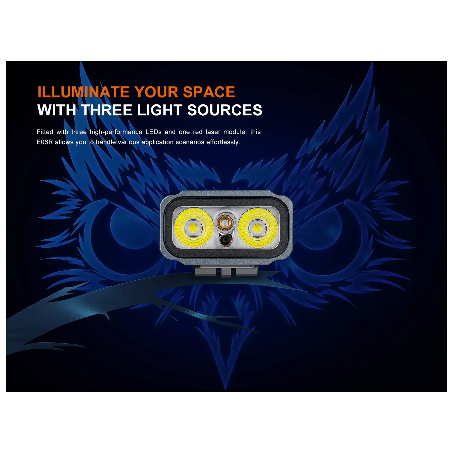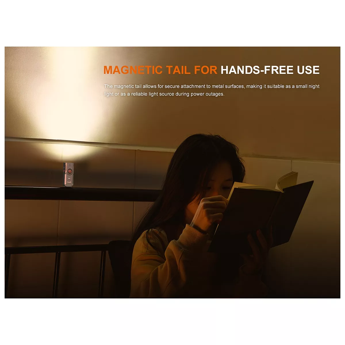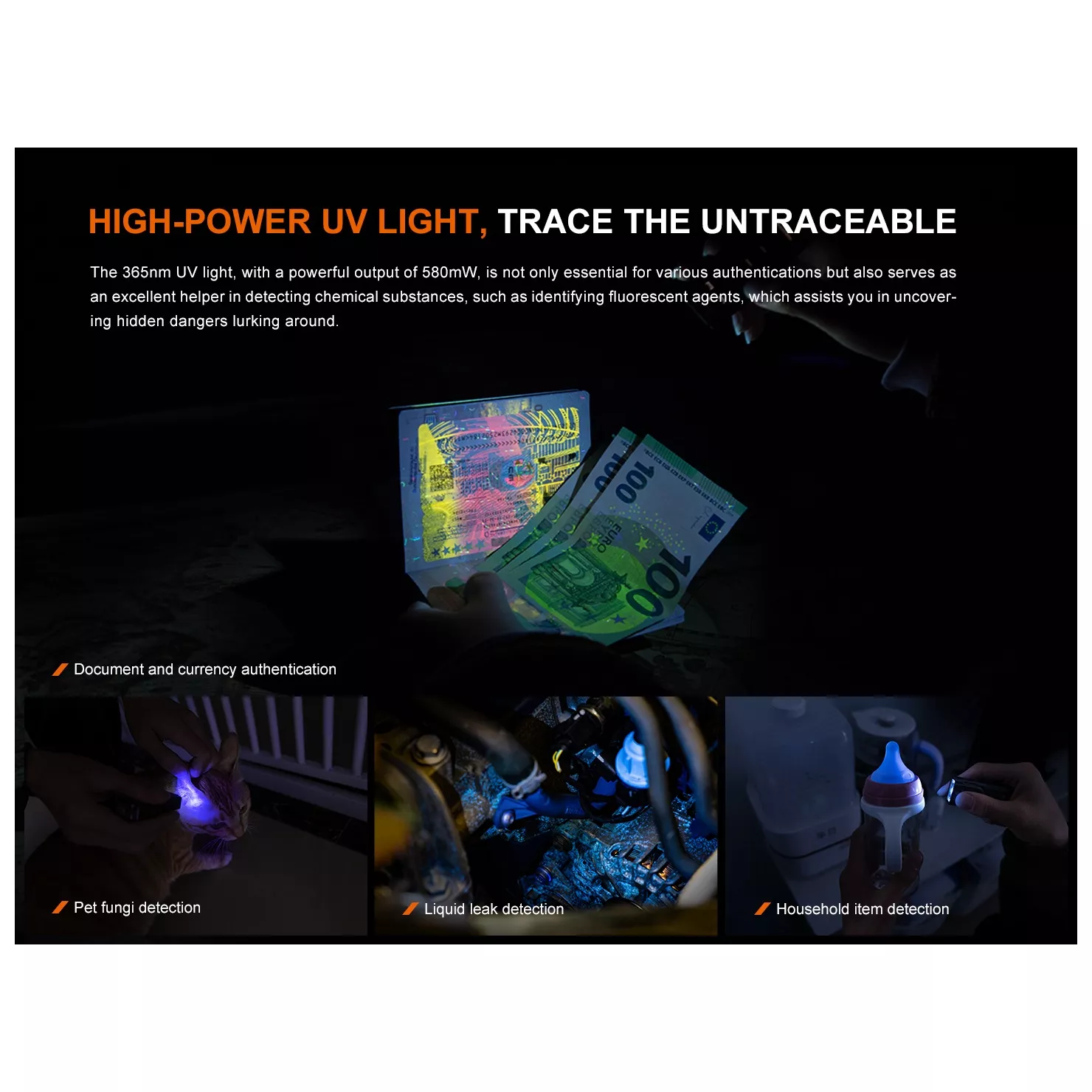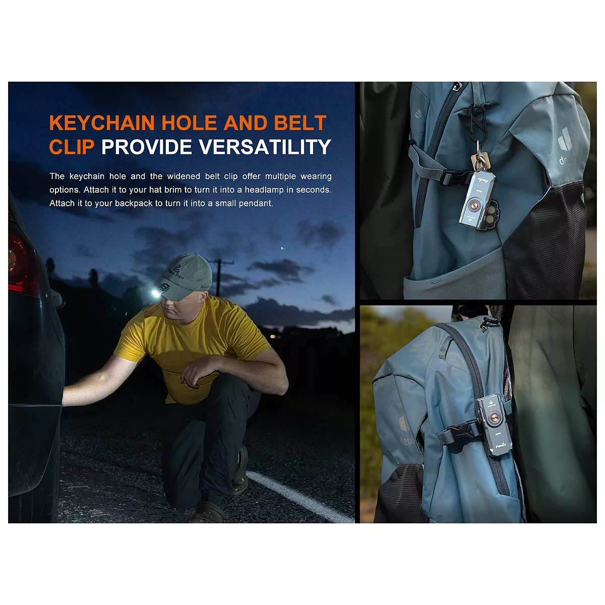 Fenix E06R je větší variantou úspěšné miniaturní nabíjecí svítilny Fenix E03R V2.0. Proti ní má nejen vyšší výkon, ale i ultrafialové světlo a laserové ukazovátko. I přes kompaktní rozměry a váhu pouhých 54 gramů nabízí vysoký světelný tok až 700 lumenů (ANSI). Světelný kužel rovnoměrně osvětluje široký prostor až do vzdálenosti 110 metrů. K napájení slouží integrovaný akumulátor s kapacitou 750 mAh, který se nabíjí přes moderní USB-C konektor na boku svítilny. K dispozici jsou celkem čtyři režimy bílého světla, UV světlo s vlnovou délkou 365 nm o síle 580 mW, červený laser (ukazovátko ≤0,39 mW) a několik režimů tzv. Breathing light - světla okolo spínacího tlačítka o síle 0,5 až 1 lumen, které využijete pro nenápadnou signalizaci, či identifikaci umístění svítilny. Svítilna je dodávána včetně pevného klipu, takže ji můžete uchytit na kapsu, popruh batohu či kšilt čepice a uvolnit si tak při svícení ruce. Díky magnetu v patce svítilny ji můžete přichytit k čemukoli železnému. Praktický je také indikátor stavu nabití baterie v tlačítku. Svítilna je skvělá pro EDC a díky malým rozměrům, plochému tvaru a váze ji můžete mít stále u sebe.