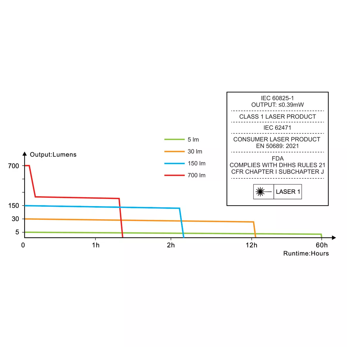 • Čtyři režimy bílého světla: 700 lumenů (1,3 hodiny) -> 150 lumenů (2,8 hodiny) -> 30 lumenů (12 hodin) -> 5 lumenů (60 hodin).