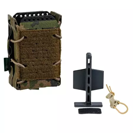Vyrobeno z ABS plastu vyztuženého skelnými vlákny (vytištěno 3D tiskem) pro odolnost a nízkou hmotnost. Nastavitelné pro širokou škálu pistolových a PM zásobníků v různých výškách.