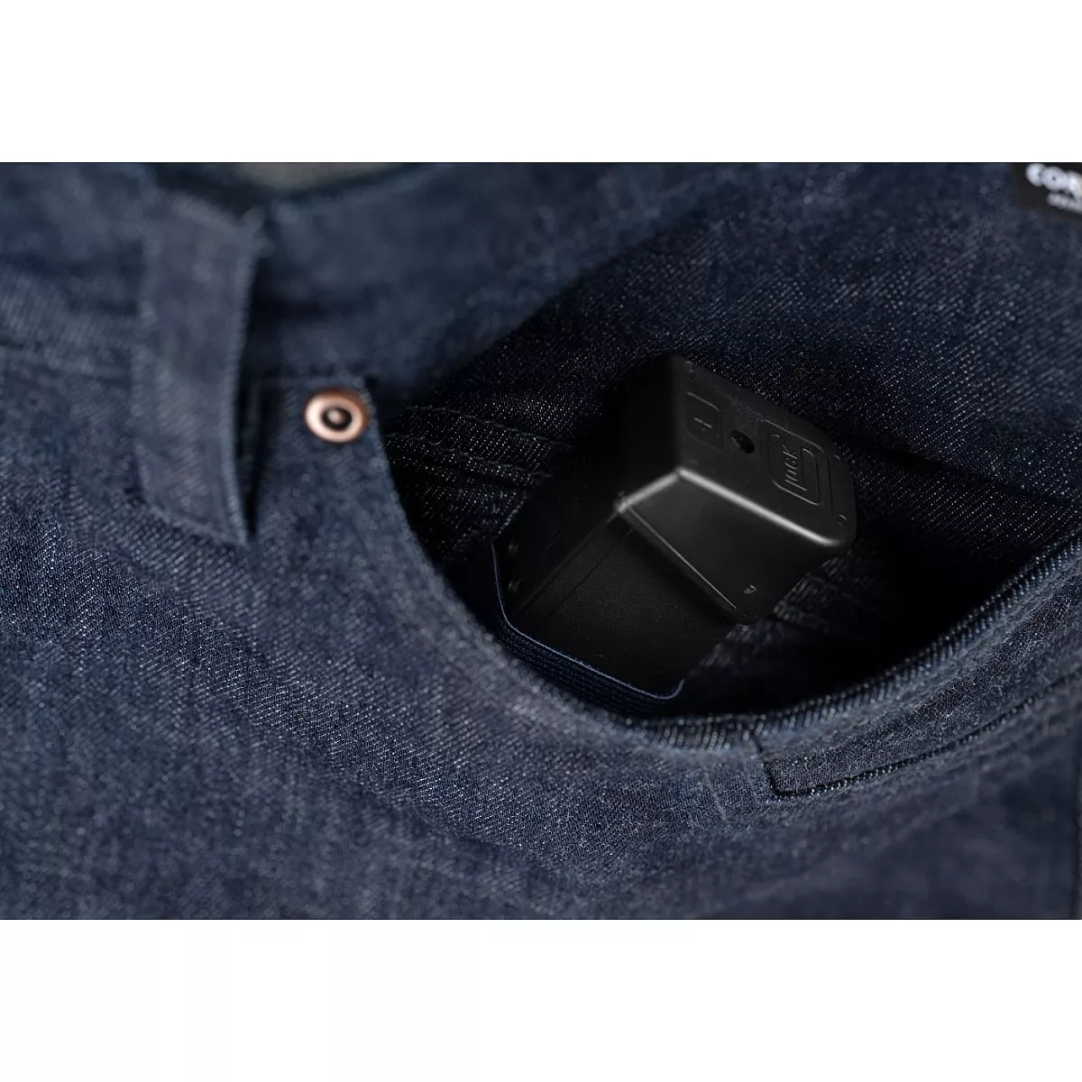 Klasický střih s 5 kapsami zůstává čistý a civilní. Přední kapsy (přístupné shora) umožňuje ukládání a vytahování předmětů jednou rukou. Systém zadních kapes spojuje vnitřní dílčí kapsy za našitým kapsami. To umožňuje nenápadné nošení drobností, jako jsou zásobníky do pistole, beze změny vnějšího vzhledu. Protiskluzové silikonové zóny uvnitř zadních kapes pomáhají stabilizovat nošené předměty a omezují posouvání během pohybu.