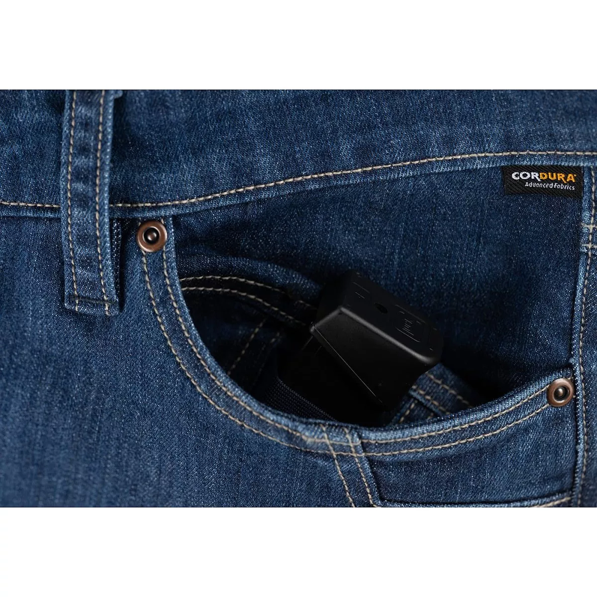 Klasický střih s 5 kapsami zůstává čistý a civilní. Přední kapsy (přístupné shora) umožňuje ukládání a vytahování předmětů jednou rukou. Systém zadních kapes spojuje vnitřní dílčí kapsy za našitým kapsami. To umožňuje nenápadné nošení drobností, jako jsou zásobníky do pistole, beze změny vnějšího vzhledu. Protiskluzové silikonové zóny uvnitř zadních kapes pomáhají stabilizovat nošené předměty a omezují posouvání během pohybu.