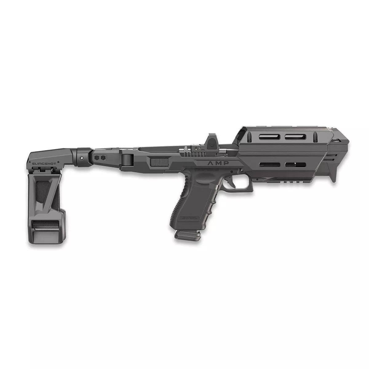 AMP je naše nejnovější generace systémů pro konverzi pistolí. Tato nová modulární konstrukce obsahuje tři vyměnitelné adaptéry. Výměna a kombinace různých adaptérů umožňuje uživateli přizpůsobit AMP různým modelům pistolí. Otevřená konstrukce je navíc optimalizována pro optiku montovanou na závěr.