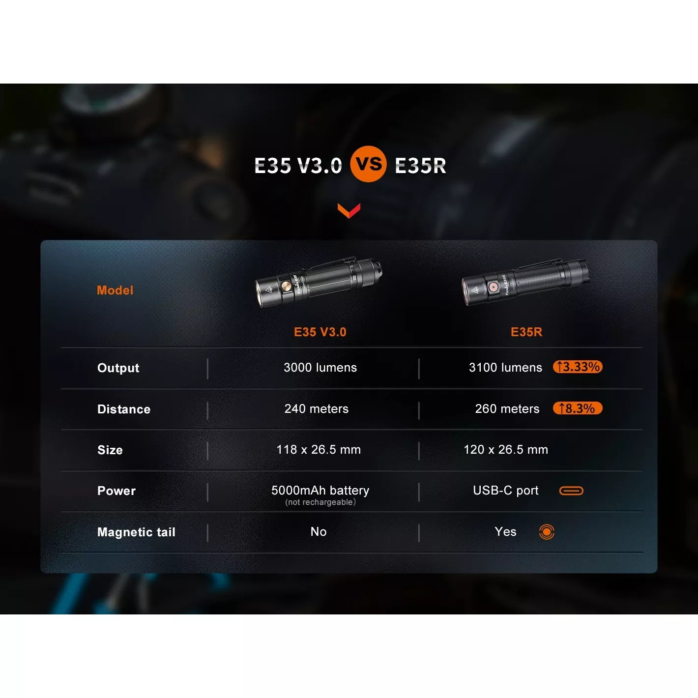 Nabíjecí kapesní svítilna Fenix E35R nabízí světelný tok až 3100 lumenů (ANSI) a dosvit až 260 metrů. Výborného výkonu bylo dosaženo použitím moderní LED Luminus SST-70. K napájení slouží vysokokapacitní Li-ion akumulátor typu 21700 s kapacitou 5000 mAh. Jeho dobíjení se provádí prostřednictvím USB-C konektoru na boku svítilny. E35R nahrazuje úspěšnou svítilnu E35 V3.0, proti ní má navíc vestavěný nabíjecí konektor a magnetickou koncovku. Svítilna byla navržena s ohledem na jednoduchost ovládání a širokou použitelnost. Šest světelných funkcí umožňuje zvolit mezi vysokým výkonem a výdrží více než dva a půl dne. K dispozici je i oslepující stroboskop pro nouzové situace.