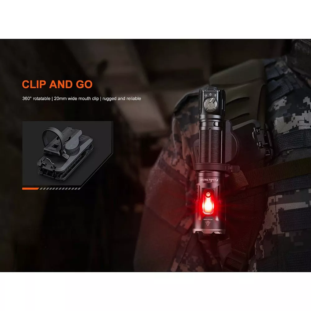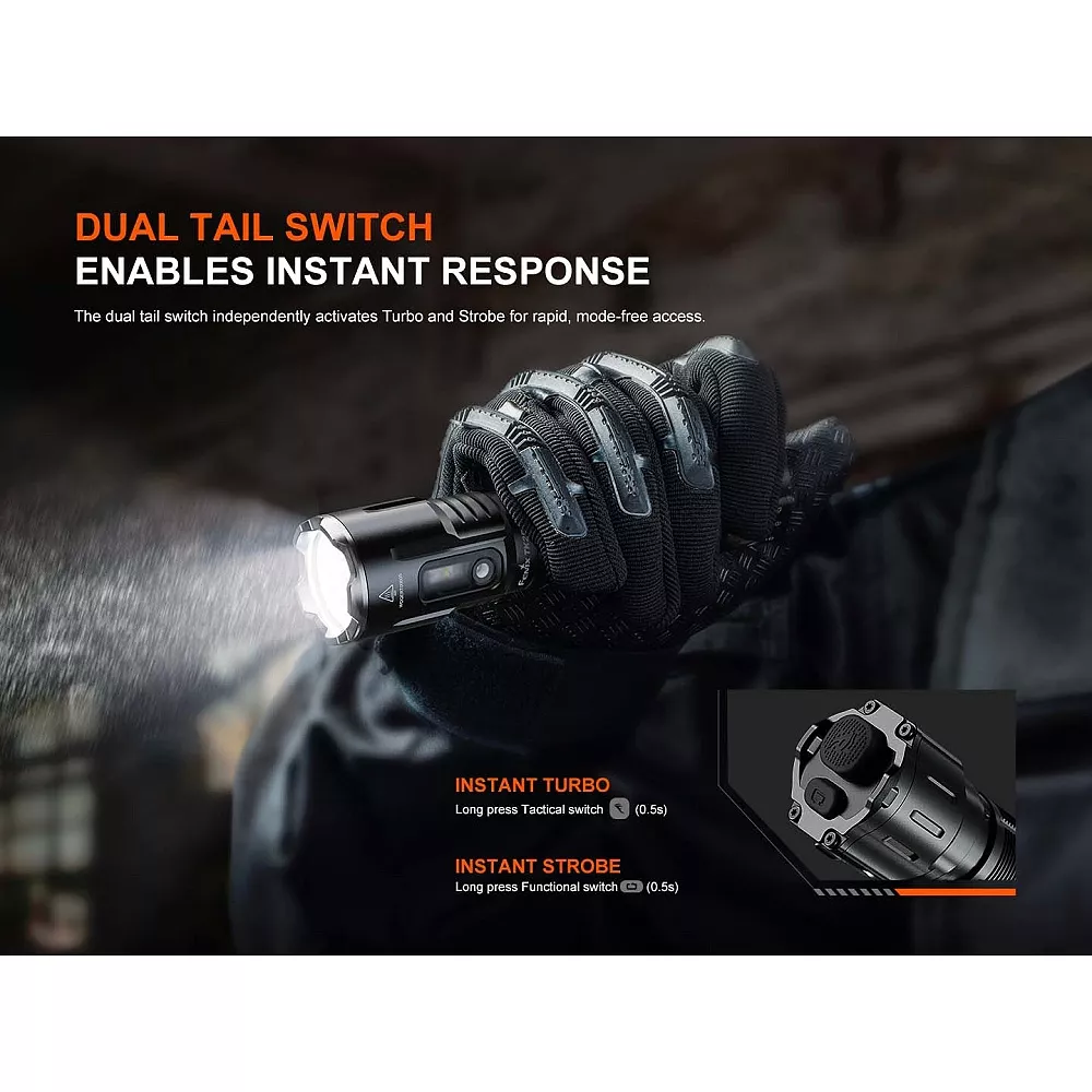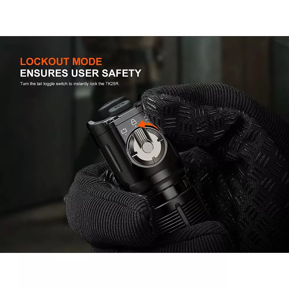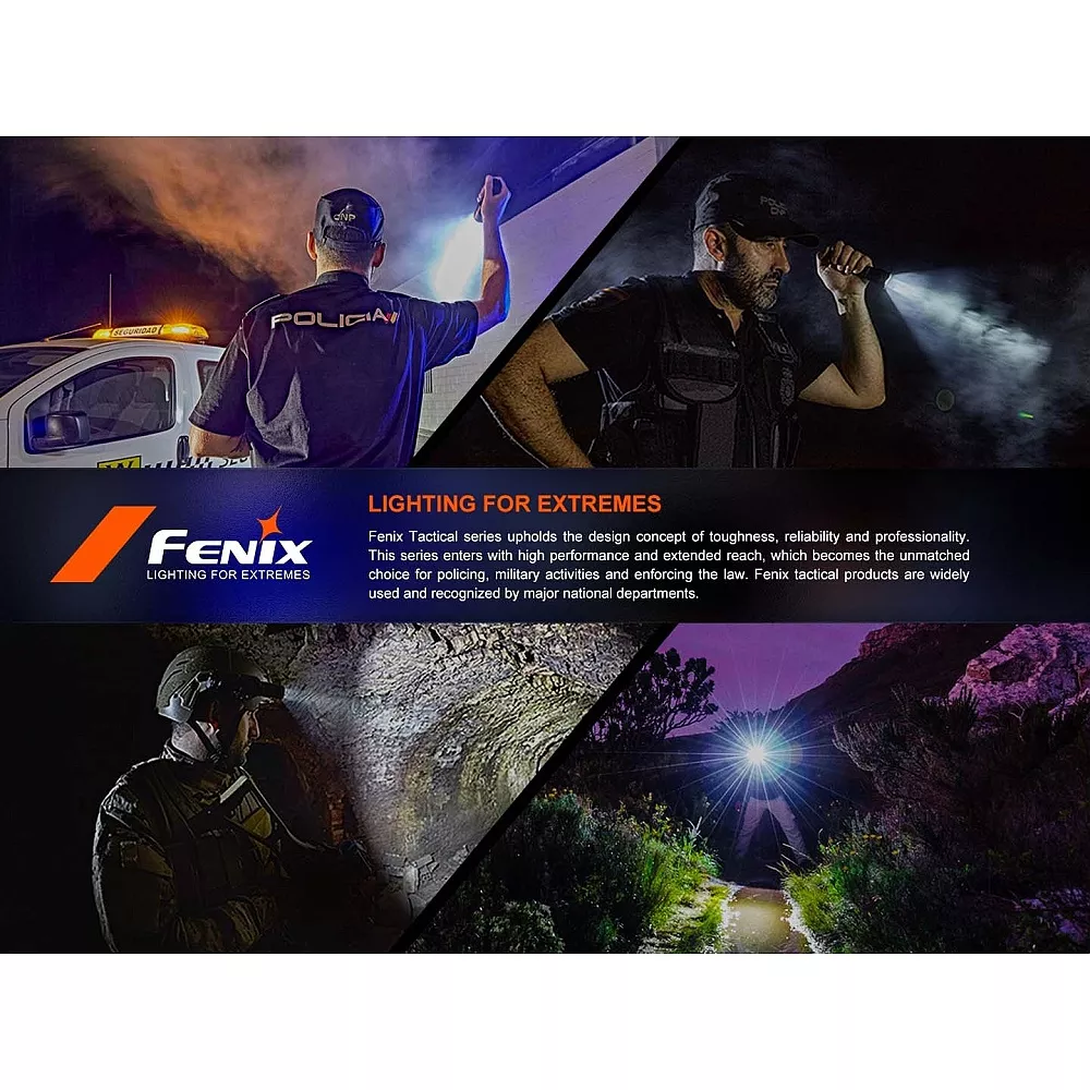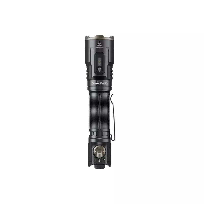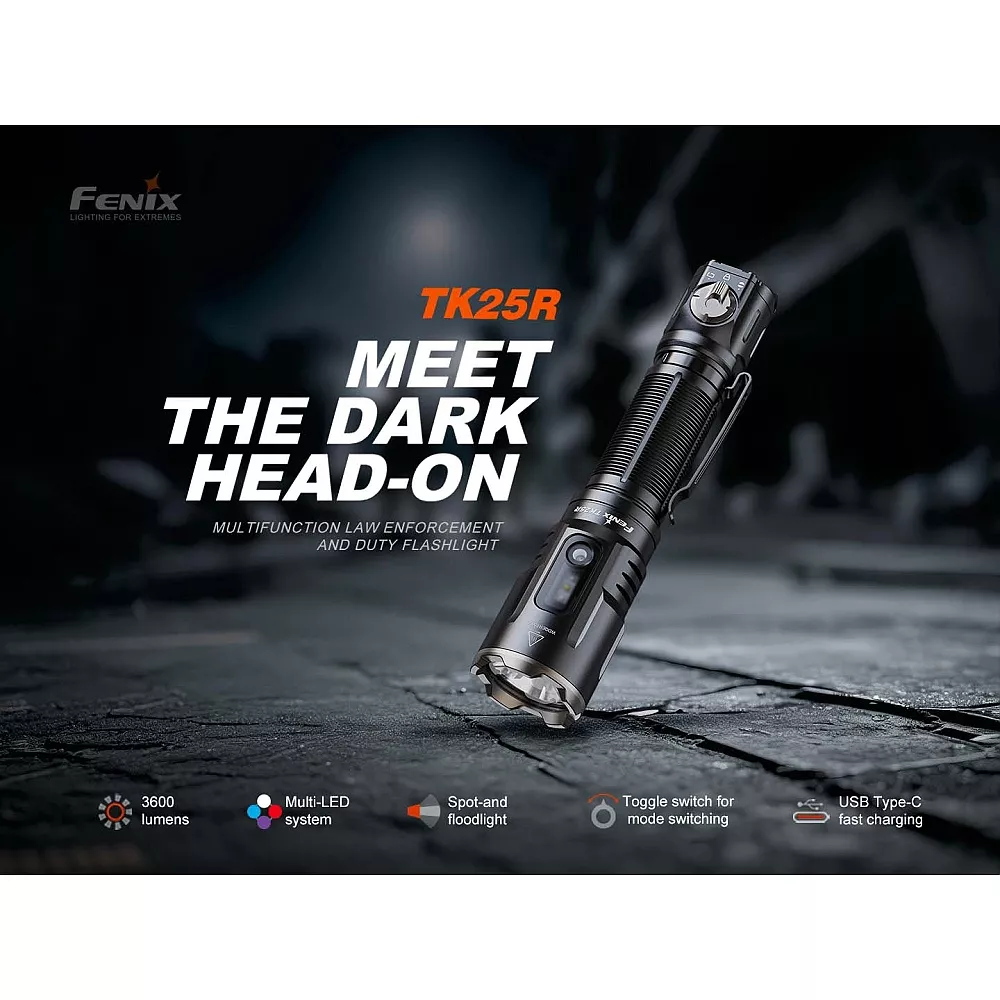 Fenix TK25R je špičková taktická svítilna, která nabízí vysoký výkon a univerzální využití díky kombinaci hlavního a bočního reflektoru. Hlavní reflektor s prémiovou LED Cree XHP50.3 poskytuje světelný tok až 3600 lumenů s dosvitem 350 metrů. Unikátní vlastností tohoto modelu je integrované boční světlo, které disponuje difuzním bílým, červeným a ultrafialovým světlem (365 nm) o výkonu až 700 mW, které umožní například rychlou kontrolu pravosti dokladů a bankovek, vytvrzování lepidel či kontrolu úniku kapalin. Dále je boční světlo vybaveno funkcí červeno-modrého blikání, což ocení zejména ozbrojené složky. Napájení zajišťuje Li-ion akumulátor typu 21700 (Fenix ARB-L21-5000 V2.0) s kapacitou 5000 mAh, který se nabíjí přes moderní USB-C konektor přímo na těle svítilny. Tělo je vyrobeno z odolné hliníkové slitiny A6061-T6 s tvrdou anodizací a je plně vodotěsné a prachotěsné dle standardu IP68.