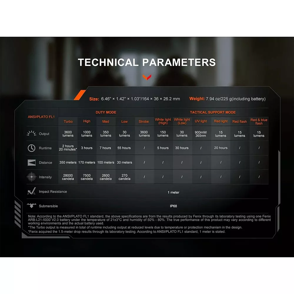Všechny parametry svítilny (světelný tok, doba provozu na baterie, vodotěsnost a dosvit) jsou změřeny v souladu s normou ANSI/NEMA FL 1-2009.