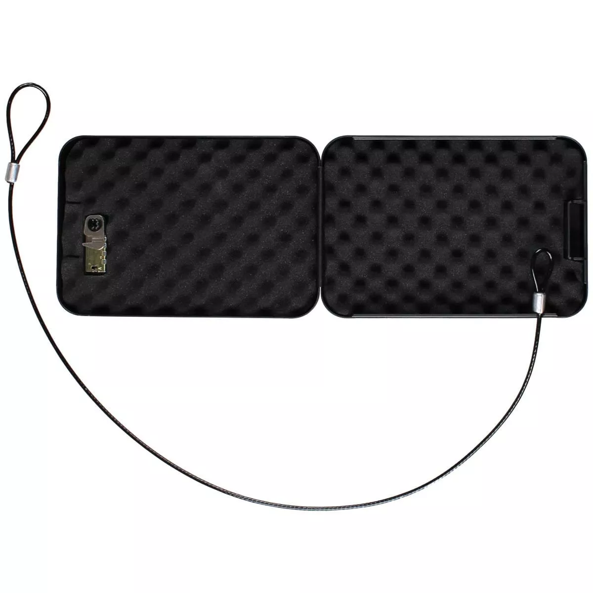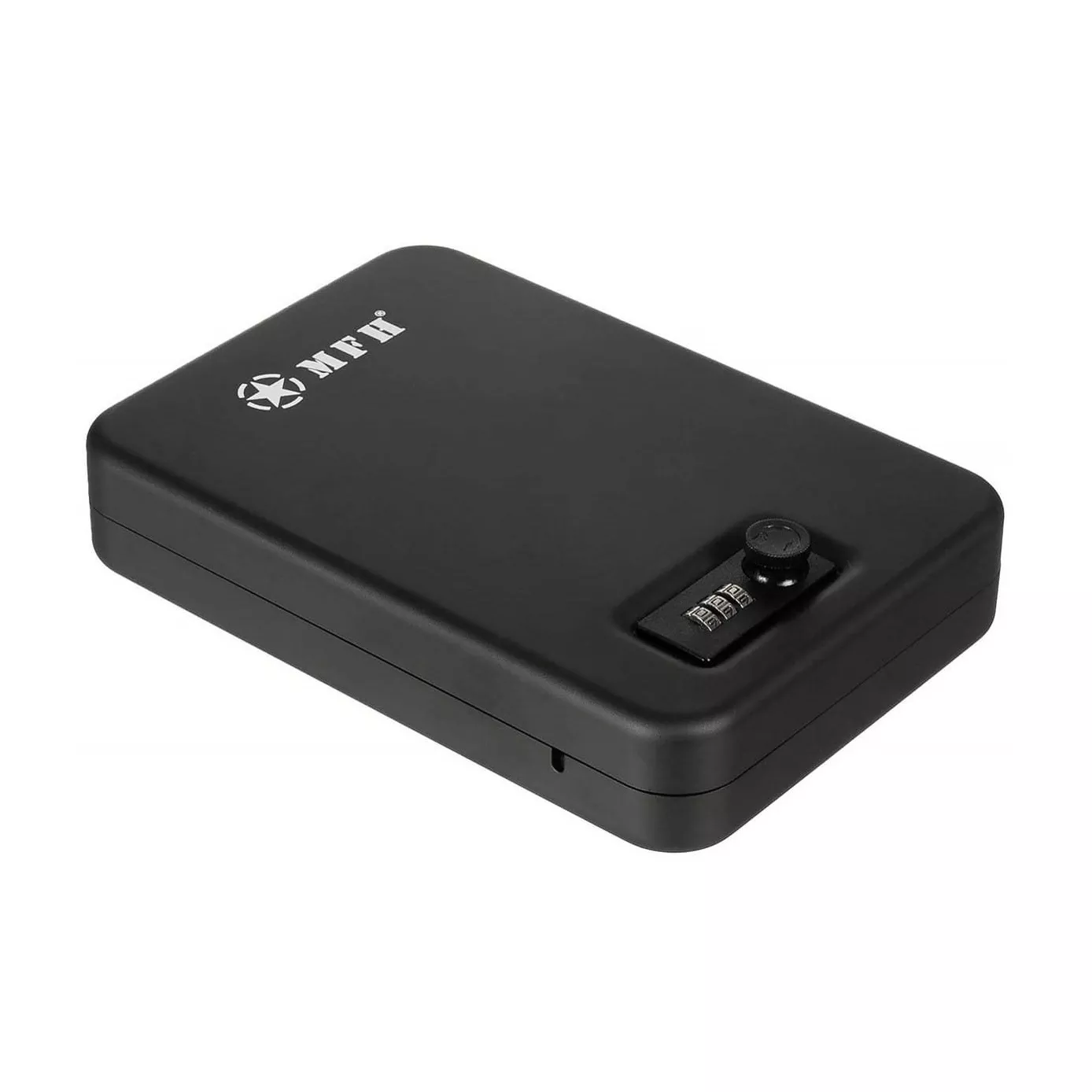 Bezpečnostní pouzdro se zámkem od společnosti MFH umožňuje bezpečně uložit drobné cenné předměty - telefon, doklady, hotovost. Vyrobeno z oceli, natřeno černou práškovou barvou a uvnitř polstrováno měkkou pěnou. Skvěle se hodí doma, v práci, v autě, na lodi nebo během výletů.Kufřík je uzamykatelný zámkem s třímístným kódem. Proti krádeži jej lze dále zabezpečit přiloženým ocelovým lankem o délce cca 90 cm nebo přišroubováním k vybranému povrchu - na zadní stěně jsou dva montážní otvory.