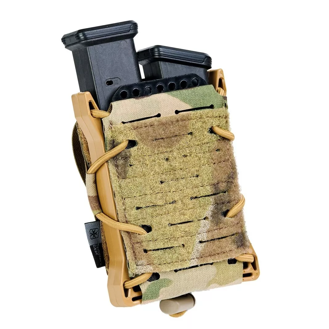 Vyrobeno z ABS plastu vyztuženého skelnými vlákny (vytištěno 3D tiskem) pro odolnost a nízkou hmotnost. Nastavitelné pro širokou škálu pistolových a PM zásobníků v různých výškách.