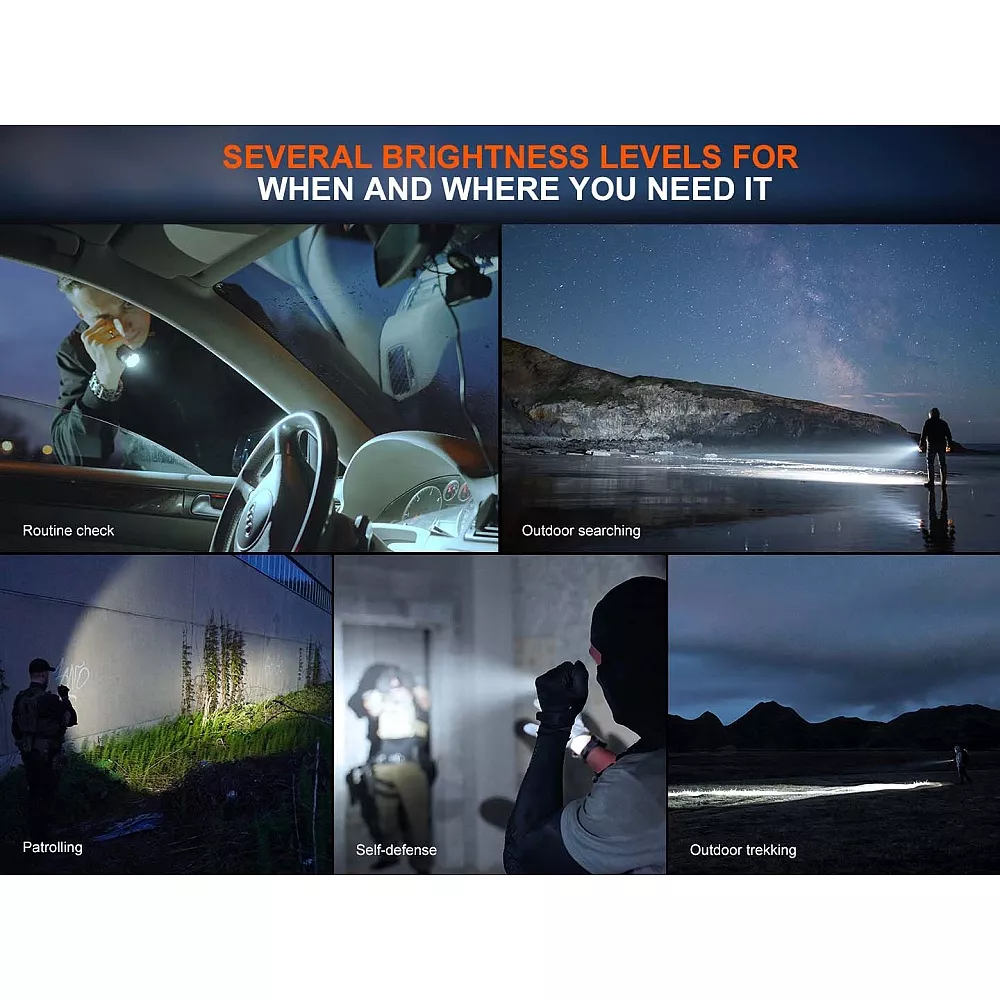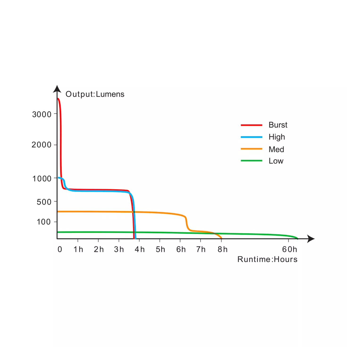 - Pět režimů výkonu: burst 3600 lumenů (3 h 45 min) -> 1000 lumenů (3 h 50 min) -> 350 lumenů (8 hodin) -> 30 lumenů (60 hodin) -> stroboskop 3000 lumenů (stroboskopické blikání s proměnlivou frekvencí).