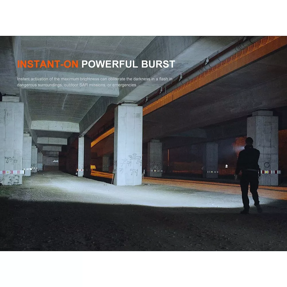 - Pro zapnutí zmáčkněte větší taktické tlačítko umístěné na konci svítilny, pro okamžitou aktivaci tlačítko namáčkněte. Stiskem vedlejšího přepínacího tlačítka můžete kdykoliv během provozu přepínat mezi režimy výkonu. Pro přepnutí do zábleskového režimu při zapnuté svítilně přidržte přepínací tlačítko zhruba 0,5 sekundy. Pro zapnutí svítilny přímo do stroboskopického režimu stiskněte a držte přepínací tlačítko. Režim BURST (3600 lumenů) lze také kdykoliv přímo aktivovat podržením hlavního taktického tlačítka po dobu 0,5 sekundy.