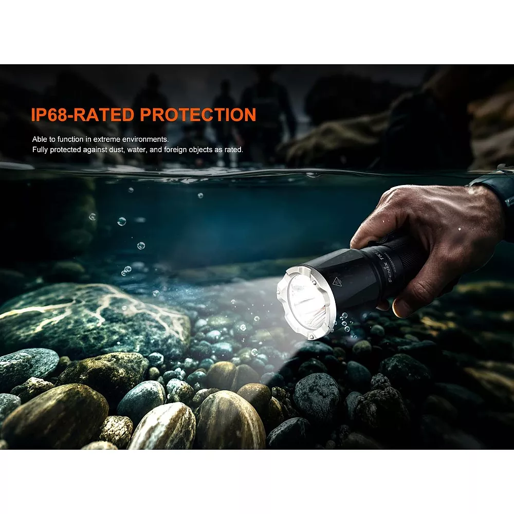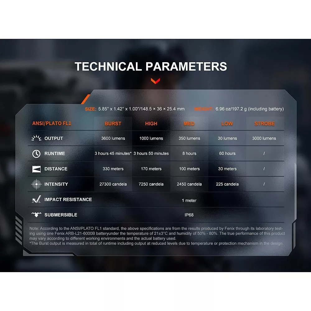 - Jako volitelné příslušenství lze dokoupit: taktický kroužek Fenix ALR-01, kabelový spínač AER-05 a AER-04 (bez stroboskopu, maximální výkon je omezen na 1200 lm), bílý difuzér AOD-M, bílý a červený dopravní kužel AOT-04.
