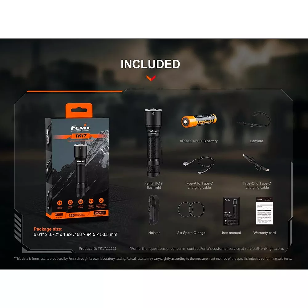 - Ke svítilně je přiložen akumulátor Fenix ARB-L21-6000B s USB-C konektorem a funkcí powerbanky, nabíjecí kabel USB-C/USB-C i USB-A/USB-C, šňůrka na zápěstí, pouzdro na opasek a náhradní O-kroužek.