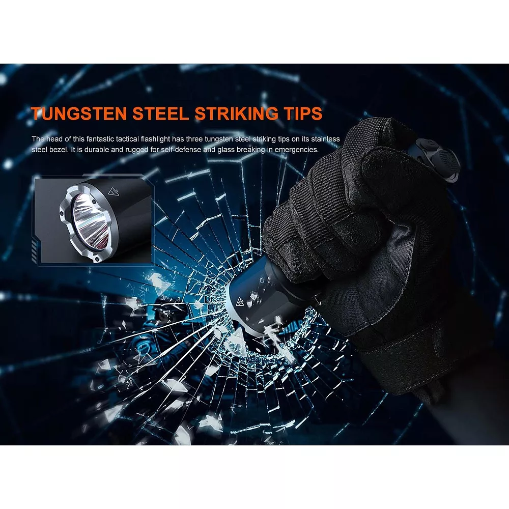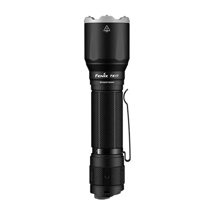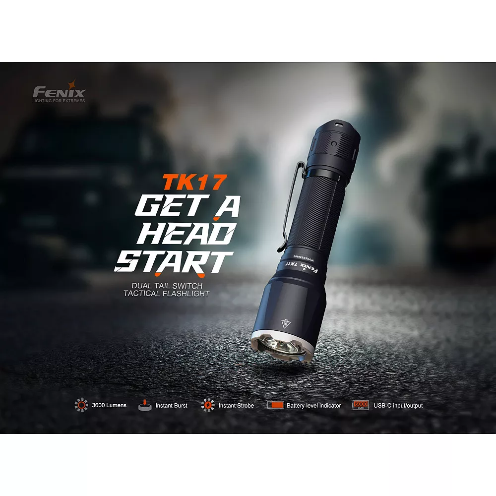 LED svítilna Fenix TK17 používá duální taktický spínač, který umožňuje rychlejší a spolehlivější ovládání v krizových situacích. Lze ji například rychle zapnout přímo do stroboskopického režimu nebo do nejvyššího výkonu. Hlava svítilny je opatřena úderným ráfkem z nerezové oceli, který je navíc vybaven třemi wolframovými hroty. Proto lze svítilnu efektivně použít k proražení skla v krizových situacích či k sebeobraně.