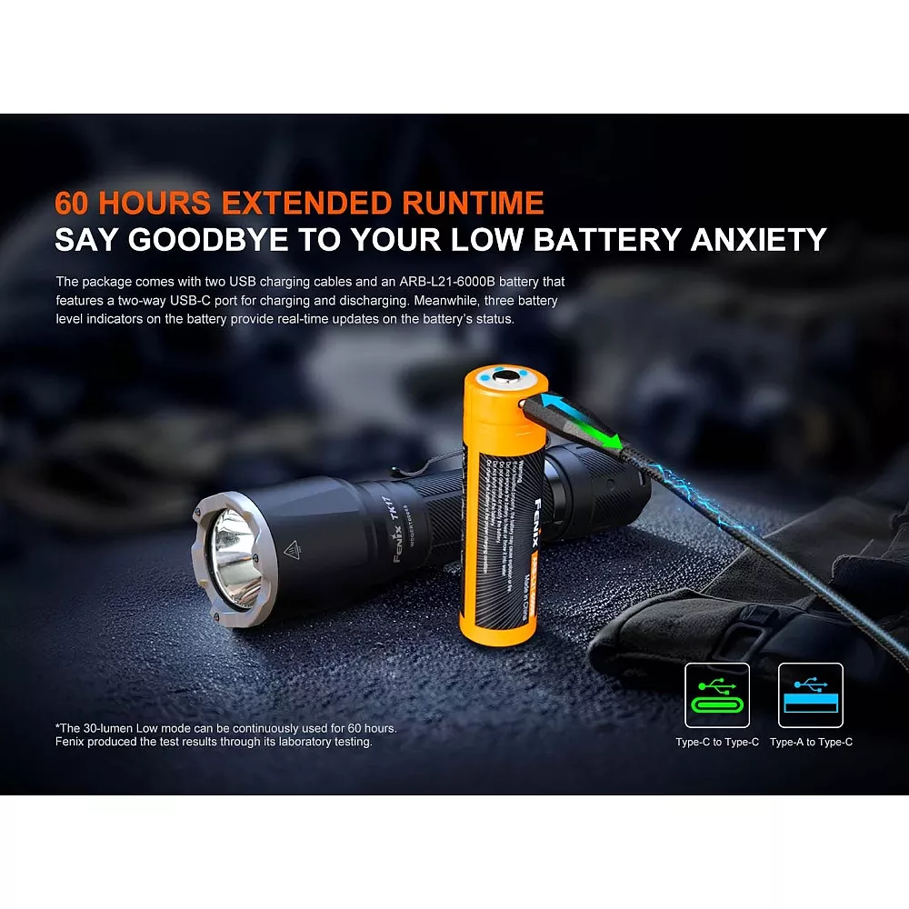 - Ke svítilně je přiložen akumulátor Fenix ARB-L21-6000B s USB-C konektorem a funkcí powerbanky, nabíjecí kabel USB-C/USB-C i USB-A/USB-C, šňůrka na zápěstí, pouzdro na opasek a náhradní O-kroužek.