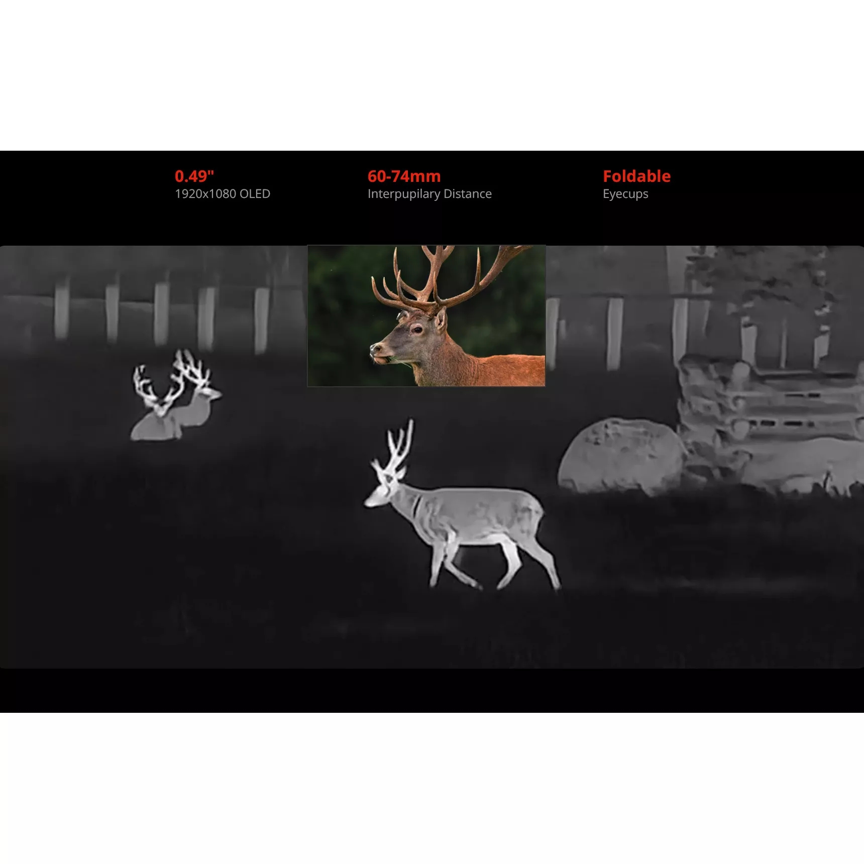 Každý detail je navržen pro pohodlí a soustředění. Nastavitelná mezipupilární vzdálenost 60-74 mm dalekohledu HIKMICRO HABROK 4K 2.0 a velký 0,49'' OLED displej o rozlišení 1920x1080 nabízí pohodlí, díky kterému se můžete věnovat každému okamžiku lovu a sklopné okuláry nabízejí stejné pohodlí lovcům s brýlemi.