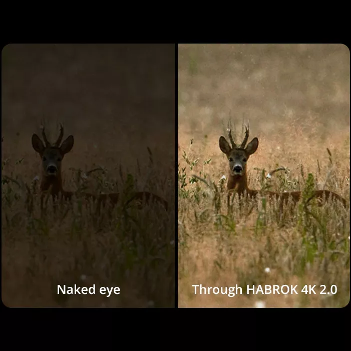 Špičkový snímač 4K CMOS zachycuje obdivuhodné detaily a přirozené barvy a zachovává autentický vzhled každé scény. Obzvláště za soumraku, kdy optická zařízení již přestávají fungovat, zajišťuje vícespektrální binokulární dalekohled HABROK 4K 2.0 i nadále ostré a živé vidění a prodlouží lov o několik dalších potřebných minut.