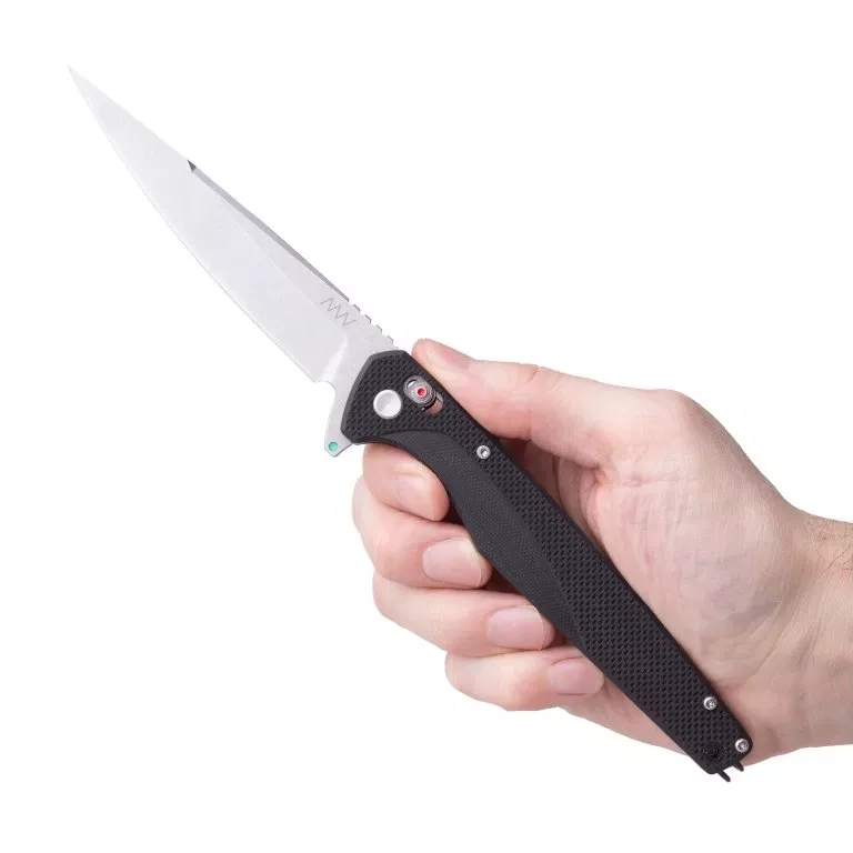 K dispozici jsou dvě varianty – s flipperem nebo oboustranným kolíkem. Obě verze se hladce otevírají díky ložiskům a pojistka, jak je u řady A zvykem, je spolehlivý A-lock. Konstrukce se opírá o frézované střenky z černého materiálu G10, které kombinují ergonomii, nízkou hmotnost a příjemný dlouhý úchop.